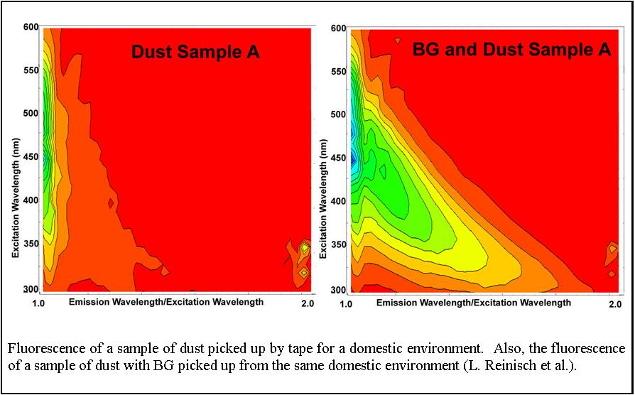 fluorescence spectra of an Anthrax simulant compared to the fluorescense of a sample background. Click Thumbnail to Enlarge